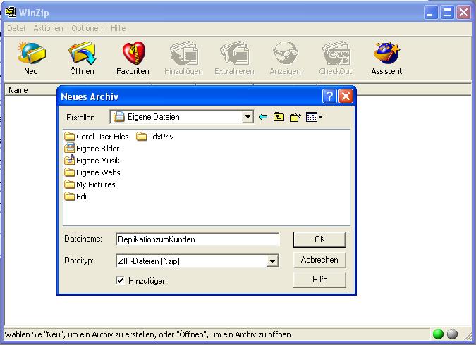 Jeder Anwender ist selber für die Datensicherung verantwortlich! Dieser Menüpunkt sichert / rücksichert die Daten auf Disketten oder einem anderen Medium. Als Voraussetzung muss WINZIP auf den Rechnern auf der C-Partion normal installiert sein. Als Beispiel das Anfangsbild von WINZIP beim Anlegen einer neuen Sicherungsdatei. Die genaue Handhabung von WINZIP wird in der Dokumentation von WINZIP erläutert. Deshalb gehen wir an dieser Stelle nicht näher auf den Punkt ein. |