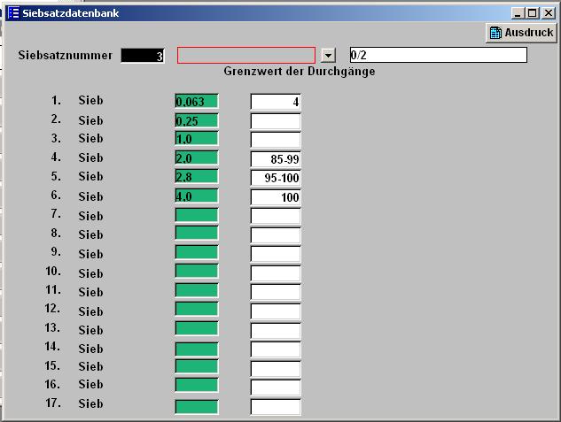 Mit Hilfe der Siebsätze ist in CONCRETEWIN die variable Möglichkeit der Auswertung von Absiebungen und Sieblinien gegeben worden. Der Anwender kann selber entscheiden, welchen Siebsatz er mit welchen Grenzwerten verwenden will. Je nach Bedarf kann er sich die Siebe und deren Grenzwerte zusammenstellen. Werden für Sande unterschiedliche Grenzwerte benötigt, so wird einfach eine neue Siebsatznummer vergeben und die entsprechenden Siebsätze mit den Grenzwerten eingetragen. Besonders deutlich sind die Unterschiede in den Siebsätzen zwischen Kieswerken und Transportbetonwerken. Das Transportbetonwerk braucht für seine Eigenüberwachung nur Siebe wie 0,125, 0,25 ... bis 31,5. Das Kieswerk braucht deutlich andere Siebe für seine Eigenüberwachung, um die Anforderungen nach Norm zu überprüfen. Der obige Siebsatz Nr. 3 ist in der Demodatenbank vorhanden. Auf den grünen Feldern können Sie über die Nachschlagehilfe (STRG + Leertaste) sich die Siebgrößen anzeigen lassen. Falls ein Sieb hier nicht vorhanden sein sollte, kann es unter 4 Siebgrößen hinterlegt werden. Für die Sieblinien im Beton, wie Sie bei Transportbetonwerken gebraucht werden, ist der nachfolgende Siebsatz angelegt. Für die verschiedenen Gesteinskörnungsprüfungen können jetzt die entsprechenden Siebsätze angelegt werden. |