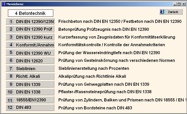 Das Betonprüfungsmenü umfasst neben den Prüfzeugnissen Festigkeit und WU auch noch die Sieblinienerstellung, Alkaliprüfzeugnisse sowie einige Betonfertigware wie Gehwegplatten, Bordsteine etc.