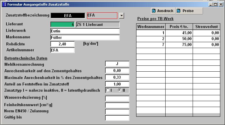 Das Feld Gültig bis dient dazu, Ihnen einen Warnhinweis beim Start von CONCRETEWIN zu geben, wenn ein Zusatzstoff oder ein Zusatzmittel abgelaufene Zulassungen haben. Sie können diesen Warnhinweis ab/einschalten, wenn Sie in den 1 Parameter 7 Betriebsdaten ein Schaltfeld setzen siehe --> Betriebsdaten Entwurf/Kalkulation In der Tabelle Preise können für die einzelnen Werksnummern die Preise sowie eventuelle Streuverluste in % erfasst werden.