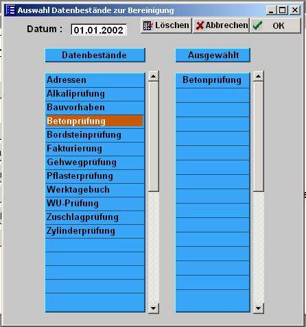 Machen Sie vor dem Löschen zuerst eine Datensicherung! Mit Hilfe dieses Menüpunktes können Sie bestimmte Prüfungen löschen, die vor dem Datum liegen. Im Beispiel werden alle Prüfungen in der Betonprüfung gelöscht, die vor dem 01.01.2002 Ihr Prüfdatum haben. Nach erfolgter Löschung sollten Sie die Komprimierung der Datenbank durchlaufen lassen. --> Komprimieren Datenbanken Mandanten: Es werden nur die Prüfungen innerhalb des aktuellen Mandanten gelöscht!! |