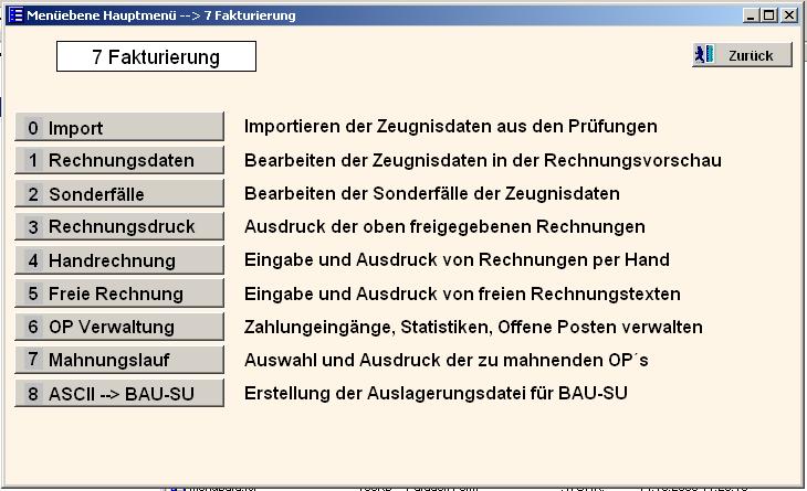 Für die Rechnungslegung sind eine Reihe von Einstellungen vorgesehen. Die meisten Kunden haben angepasste Rechnungs- oder Mahnungsreports. Die Punkte 0-3 dienen dazu direkt aus den erfassten Zeugnissen heraus eine Rechnung zu bilden und zu verbuchen. Die Punkte 4+5 dienen dazu, Rechnungen zu erfassen, zu drucken und zu buchen. Sie unterscheiden sich nur etwas in dem Aufbau der Maske, ansonsten sind sie identisch. Die Punkte 6+7 dienen dazu, die Offenen Posten zu verwalten und eventuell notwendige Mahnungen zu erstellen. Der Punkt 8 dient zum Export der notwendigen Daten für eine externe Finanzbuchhaltung. |