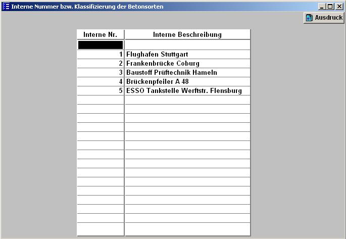 Die Interne Nummer soll als weiteres Infofeld für den Betontechnologen dienen. Sie wird nirgends mit ausgedruckt. Der Betontechnologe kann für sich als Gedankenstütze hinterlegen, weshalb oder für wen er eine Betonsorte mal entwickelt hat. |