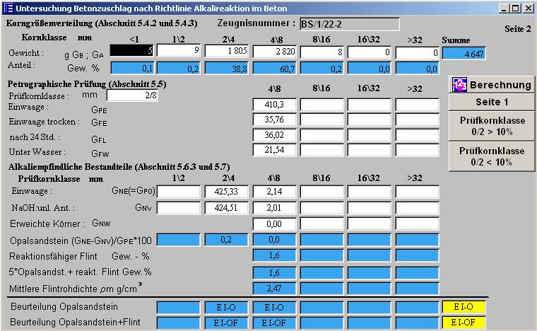 Hier sehen Sie, das wir die Prüfkornklasse 2/8 in zwei Spalten eingetragen haben. Das liegt daran, das bis 4 mm keine Petrographische Prüfung vorgenommen wird, da die Körner einfach zu klein sind. Ansonsten ist die Eintragung analog der oberen vorzunehmen. Wozu dienen die beiden Schaltflächen Prüfkornklasse 0/2 < 10% und 0/2 > 10 %? Das ist dafür gedacht, das sie bei der Prüfkornklasse 1/2 auch mal Werte bei der Einwaage GNE und NAOH: unl. Anteil von 0 haben. Wenn diese beiden Werte Null sind, dann ist die Einstufung natürlich E I -O, bzw. E I-OF. Da von Kunden außerdem gewünscht war, das die Null nicht eingetragen wird und somit keine Berechnung von CONCRETEWIN stattfinden kann, die Kunden aber trotzdem die Beurteilung E I-0 und E I-OF unter der Prüfkornklasse 1/2 stehen haben will, kann dieses mit den Schalter gesetzt, bzw. gelöscht werden. Dieses ist nur für die Prüfkornklasse 1/2 vorgesehen worden.
