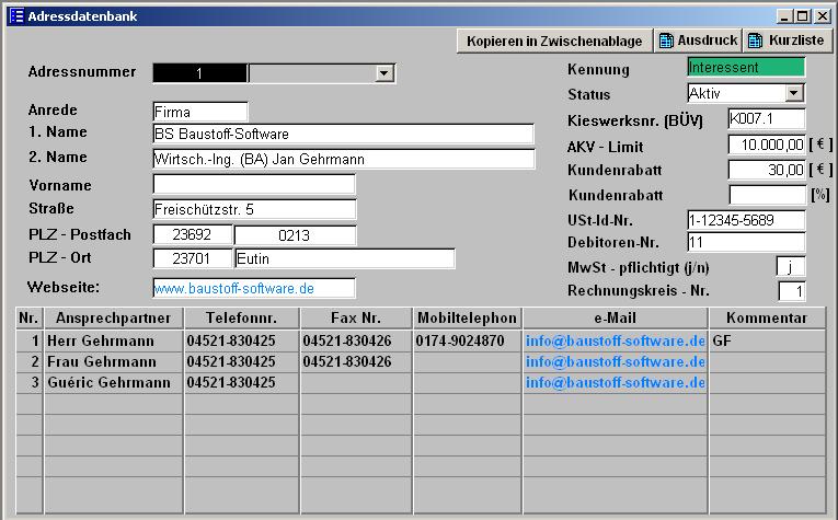In diesem Menüpunkt werden alle Adressen erfasst, die in CONCRETEWIN benötigt werden. Adressen können Kunden, Lieferanten, Interessenten etc. sein. Die Adressennummer ist der eindeutige Schlüssel der Adresse. Die Felder Kennung (Interessent --> Adresskennung) und Status dienen zur Information. Bei einem Gesperrt-Kennzeichen im Feld Status erscheint eine Warnmeldung bei der Angebotserstellung. Das Feld Kieswerksnr. (BÜV) wird auf den Alkaliprüfzeugnissen mit ausgedruckt und enthält die vom BÜV zugeteilte Prüfnummer des Werkes. Das Feld AKV-Limit wird genutzt, um die Höhe der Warenkreditversicherung einzutragen. Im Angebotsmodul wird dieses überprüft. Die Felder Kundenrabatt in Euro und in Prozent werden für die Berechnung der Angebote genutzt. Das Feld USt-Id-Nr. wird auf den Rechnungen und den Angeboten benötigt. Die Debitorenr. ist die Debitorennummer, die in einer externen Fakturierung verwendet wird. Dieses ist nur für den Daten Import / Export zu einem externer Programm wichtig. MwSt-pflichtig ist bei der Erstellung einer Rechnung notwendig. Der Rechnungskreis-Nr. hat folgende Funktion: In der Fakturierung hat man die Möglichkeit, eine neue Rechnungsnummer automatisch zu vergeben. Es gibt in CONCRETEWIN zwei mögliche Nummernkreise für die Rechnungen. Wenn man jetzt für zwei Firmen Rechnungen schreiben möchte, kann man die Adressen den einzelnen Rechnungskreisen zuordnen. In der Tabelle Ansprechpartner können verschiedene Ansprechpartner mit deren persönlichen Daten wie Telephon, Faxnummer, Mobiltelephon und eMail hinterlegt werden. Es gibt zwei Schalter zum Ausdrucken: