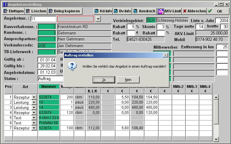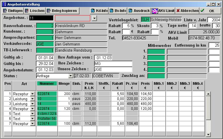 Im Vertriebsmodul können hier die Angebote aufgenommen werden. Für Bauvorhaben und Adressen können Rabatte und andere Kenndaten hinterlegt werden, als Vorgabe ins Angebot mit übernommen werden. Das Vertriebsgebiet und das Jahr kennzeichnen die Preisliste, in der nach den Preisen für eine Rezeptur gesucht werden soll. Ist die Rezeptur nicht in der Preisliste hinterlegt, wird versucht die Stoffkosten aus der Kalkulation zu ermitteln. Preise für Leistungen werden direkt in der Datenbank Rechnungspreis hinterlegt. Dazu besteht die Möglichkeit, für ein Bauvorhaben spezielle Preise zu hinterlegen. Die Hinterlegung wichtiger Beschreibungen ist über Textbausteine möglich. In den Zeilen des Angebotes (unten im Formular) wird über die Art (Rezeptur, Leistung, Text) gesteuert, wo die Nummern nachgeschlagen werden sollen und woher die Preise und Stoffkosten hergeholt werden. Die Spalte Preis lt. L/K zeigt die Preise laut Preisliste oder Bauvorhaben an. Die Spalte Stoffkosten ist nur gefüllt, wenn für die Rezeptur eine entsprechende Kalkulation durchgeführt worden war. Bei Leistungen und Textbausteinen wird nichts angezeigt. Das Feld Status kennzeichnet das Angebot. Es gibt folgende Optionen :