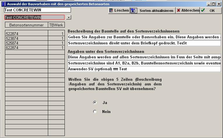Tipp: Es werden immer nur die Sorten des aktuellen gespeicherten Baustellensortenverzeichnis aktualisiert. |