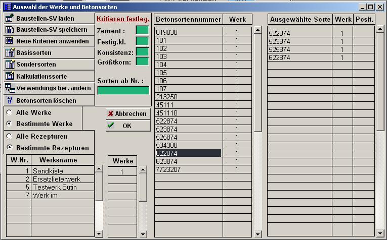 Das Baustellensortenverzeichnis dient dazu, alle für ein Bauvorhaben benötigten Rezepturen unter einem Namen zu verwalten und jederzeit wieder aufzurufen und ausdrucken zu können, ohne das alle Rezepturen erneut ausgewählt werden müssen. Zuerst müssen die Sorten eines Baustellensortenverzeichnisses ausgewählt werden. ( 522874, 523874, 525874, 622874) Zur Sortierung beim Ausdruck können in der Spalte Position die jeweilige Nummer eingetragen werden, an der diese Rezeptur gedruckt werden soll. Zum speichern des Betonsortenverzeichnis gibt es den Schalter