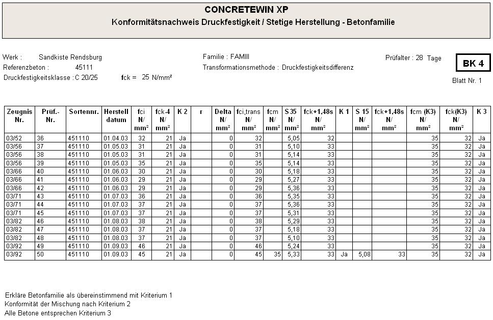 Der Ausdruck BK 4 liefert die Auswertung für die Stetige Herstellung einer Betonfamilie. Handelt es sich nicht um eine Betonfamilie, wird kein Ausdruck erstellt. Es wird erst ab dem 36 Wert gedruckt. Die Auswertungen erfolgen immer in 15 Schritten. Es wird immer das Gesamtergebnis der Konformität unten auf dem Report dargestellt. Deshalb können die vorliegenden 15 Prüfungen die Konformität erfüllen, aber die Gesamtprobe nicht. |