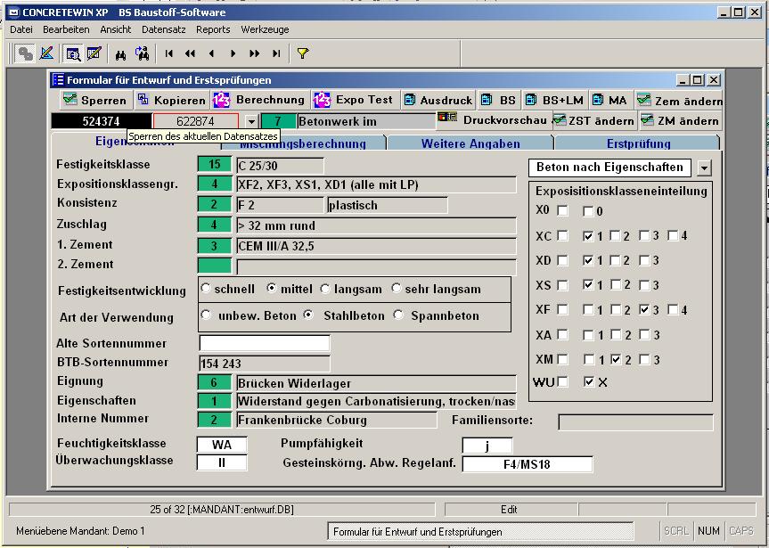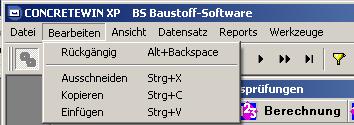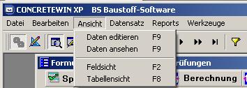 Dieser Menüpunkt soll Ihnen einen Einblick in die Symbole, Schalter und Tastenkombinationen sowie einen praktischen Aufbau von Prüfzeugnisnummern geben. Der Aufbau ist zuerst der Menüeintrag, eine kurze Beschreibung, danach die Tastaturbefehle und im Anschluß eventuell vorhandene Symbole. Am schnellsten geht es für den geübten Anwender mit den Tastaturkürzeln. Das Layout in CONCRETEWIN ist optimiert für die Grafikauflösung von 1024 * 768 bei ausgeschalteter Taskleiste und dem Design Windows Klassisch. Beim Design Windows XP kann es zu Verschiebungen und Laufleisten an den Seiten kommen. Ist die Taskleiste eingeschaltet, führt dieses in vielen Formularen zu Scrollbalken an der rechten Seite und behindert das schnelle Arbeiten mit CONCRETEWIN. Entweder wird die Auflösung hoch gesetzt oder aber die Taskleiste wird ausgeschaltet. Das Verlassen eines Formulares geschieht über eine doppeltes ESCape-Taste (kurz hintereinander) oder über das X rechts im Fenster. Datei: Hier können sie den Mandanten wechseln, das Hauptmenü wieder öffnen oder aber die Druckereinstellungen ändern sowie das Programm Beenden. Der Aufruf des Druckens wird noch im Menü implementiert. Bearbeiten: Hier können Eingaben rückgängig gemacht werden, Angaben kopiert, ausgeschnitten und eingefügt werden. Die Tastaturbefehle orientieren sich an denen von Microsoft Office. Ansicht: Hier können Formulare in den Editiermodus (View) oder nur in den Ansichtmodus (View) geschalten werden. Die Feld- und Tabellensicht gibt den Anwender die Möglichkeit zum Ändern von Daten oder einen Überblick über die gesamten Daten.