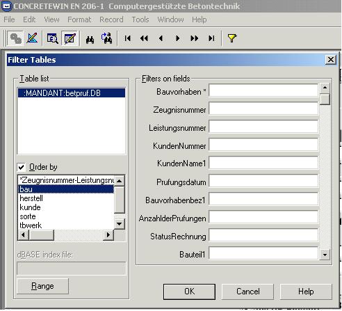In diesem Filterformular kann der Anwender rechts ein Filter Kriterium eingeben. Z.b. bei Bauvorhaben eine 1. Die hier angezeigten Felder varieren in Abhängigkeit von den unter Order by ausgewählten Schlüssel. In dem Beispiel steht an 1. Stelle *Zeugnisnummer-Leistungsnummer. Das bedeutet, dieses ist der Primärschlüssel für diese Datenbank. Da aber der Sekundärschlüssel bau gewählt wurde, wird das Feld Bauvorhaben rechts als erstes angezeigt. Sonderzeichen in Filter Um z.B. nach der Gesteinskörnung 16/32 Bäcker einen Filter zu setzen, muss der Anwender den Filterbegriff in Anführungsstriche setzen "16/32 Bäcker".