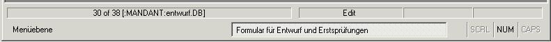 Statusleiste : Die Statusleiste am unteren Rand des Bildschirmes gibt viele Dinge Auskunft. Hier z.B. in welchem Datensatz (30 of 38 :mandant:entwurf.db) man sich befindet, das man von der Menüebene ins Formular für Entwurf und Erstprüfungen gewechselt ist, das der NUMmernblock aktiviert ist und man sich im Edit (Bearbeitenmodus) befindet und jetzt Daten ändern kann.