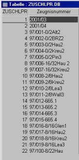 Hier sehen wir verschiedene Zuschlagsprüfungen. Der Cursor steht auf der Prüfung 2001/04. Diese ist wie die zweite Prüfung 2001/03 zwischen den ganzen alten Prüfungen aus dem Jahre 1997 einsortiert. Diese haben den Aufbau Kornfraktion/Herkunftswerk/Jahr. Wenn wir dieses mal umstellen würden, das die Jahreszahl vorne steht, dann eine laufende Nummer kommt, dann die Kornfraktion und dann das Herkunftswerk, dann sieht es schon viel besser aus. Also 97/10-2/8Kreuz