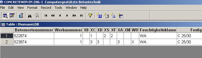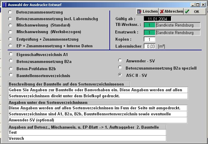 Dieser Menüpunkt dient dazu, die Daten des Entwurfes entprechend dem Aufbau der 3 Verzeichnisse (Eigenschaften, B2a und B2b) in Tabellenform darzustellen und dem Anwender die Möglichkeit zu geben, diese per Markieren (STRG + A) und Kopieren (STRG + C) in eine Tabellenkalkulation zu einzufügen (STRG + V). Voraussetzung: Vollversion Paradox 10e. Die normale kostenlos mitgelieferte Runtime von Paradox bietet diese Möglichkeit nicht. Die Vollversion von Paradox 10e kostet ca. 1.000 €. Der Ablauf entspricht dem normalen Ablauf zum Ausdrucken von Betonsorten. Sie müssen zuerst einmal die zu exportierenden Rezepturen im Entwurf "drucken" (die Rezepturen werden in einer Datei gespeichert). Sie wählen dabei aber den Schalter ASC II - SV an. Danach bestimmen Sie die gewünschten Rezepturen. Nachdem die Sorten "gedruckt" sind, wechseln Sie zum Menü 9 Ex-/Import und dort auf 9 DatenImport/Export Seite 2. Hier gibt es drei Schalter. Für das Eigenschaftsverzeichnis, für das B2a und für das B2b Blatt. Wählen Sie einen Schalter aus. Hier können Sie mittels der oben aufgeführten Tastenkombinationen STRG + A und STRG + C oder aber über Edit und den Menüpunkten Select All und Copy die angezeigten Daten exportieren.