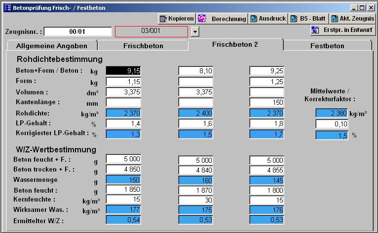 Die Rohdichtebestimmung kann entweder im LP-Topf oder in einer Form durchgeführt werden. Es muss nur eins erfasst werden, entweder das Volumen oder die Kantenlänge des Würfels. Es kann wie im angezeigten Beispiel (2. Probe) nur das Betongewicht erfasst werden werden. Dieses ist für Prüfstellen gedacht, die eine Waage mit Tara-Funktion haben und nur das reine Betongewicht im Labor ermitteln. Für den LP-Gehalt gibt es die Möglichkeit einen Korrekturfaktor einzugeben. Als Standardwert wird hier die 1 vorgegeben. Daraus errechnet sich automatisch der Korrigierte LP-Gehalt. Für den W/Z - Wertbestimmung ist es notwendig, das die Sorte in der DB Entwurf vorhanden ist. Sorten vom Lieferschein oder freie Definition können nicht verwendet werden. |