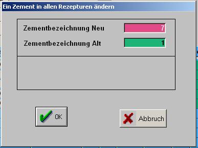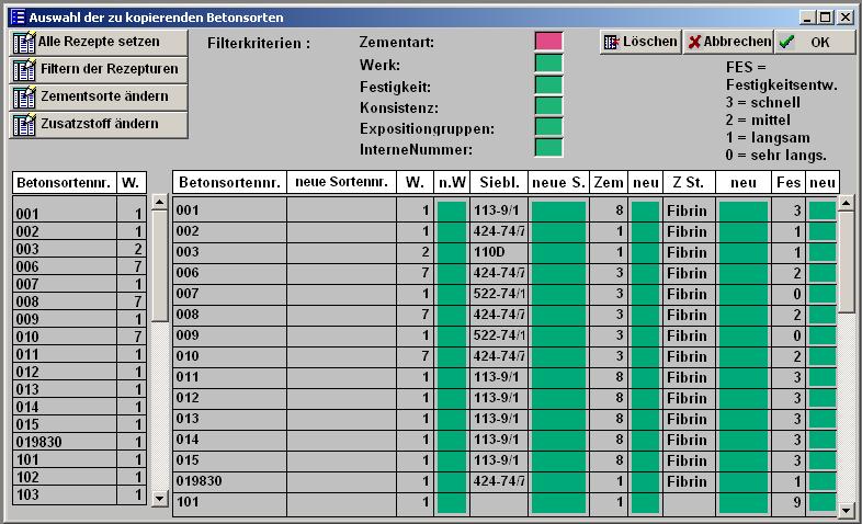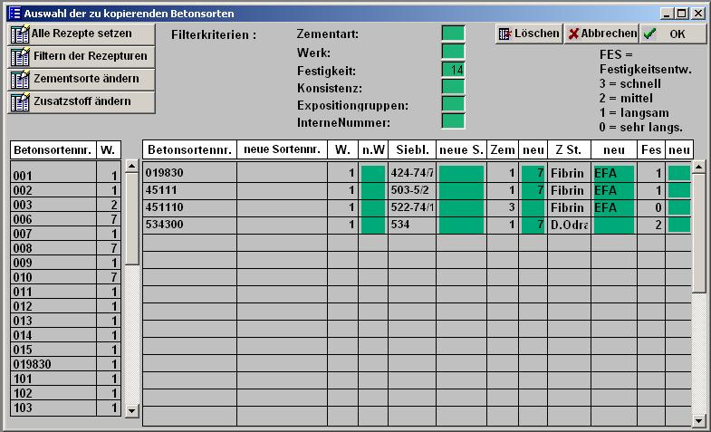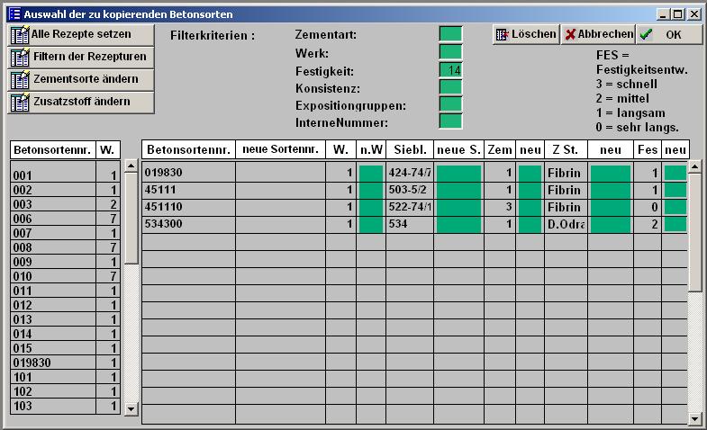 den Schalter Damit wird in Spalte Zement automatisch die 7 für die neue Zementart für alle Rezepturen gesetzt. Eine Änderung der Betonsortennummer muss aber per Hand durchgeführt werden. Als weiteres kann jetzt ein Zusatzstoff geändert werden über