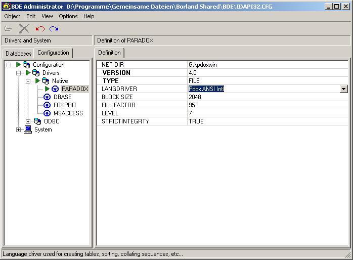 Wird in Netzwerken mit geringer Bandbreite gearbeitet (z.B. bei einem DSL-Anschluß) so sollte das Verzeichnis \database auf dem Server liegen und die anderen 3 Verzeichnisse lokal. Die meisten Punkte von Updates betreffen aber die ersten 3 Verzeichnisse. Deshalb ist hier von Seiten des lokalen Administrator eine Möglichkeit zu planen, in denen die Updates relativ einfach auf den lokalen Rechner eingespielt werden können. Die Datenbank Paradox legt in jedem Verzeichnis auf einem Netzwerk während der Nutzung zwei Lock-Dateien (*.lck) an. Diese steuern den Zugriff auf die Daten in diesem Verzeichnis. Für die Nutzung diese Dateien benötigt die Datenbank Paradox eine Netzwerksteuerdatei. Diese Datei lautet pdoxusrs.net und wird von der Datenbank Paradox selber angelegt. Sie sollte im gleichen Verzeichnis für alle Benutzer liegen. Tipp 1: Die Netzwerksteuerdatei sollte von allen Plätzen mit dem gleichen Pfadangaben angesprochen werden. Auf einem Arbeitsplatz f:\labor und auf dem anderen Arbeitsplatz g:\labor sollte möglichst vermieden werden. Tipp 2: Es gab ein paar Fälle weltweit, in denen die Verwendung der UNC-Namensgebung ( \\server-zentrale\labor ) zu Indexfehlern geführt haben. Nach der Umstellung auf ein die Laufwerksbuchstaben f:\labor war das Problem beseitigt. Hier sollte bei der Installation die Möglichkeit bedacht werden, das der UNC-Name eventuell umgeändert werden kann zu einem Laufwerksbuchstaben. Tipp 3: Die Laufwerke, auf denen das Database-Verzeichnis liegt, muss mit ausgeschaltetem Schreibcache arbeiten. Ansonsten kann keine Gewähr für Indexfehlern genommen werden. Auf jedem Arbeitsplatz muss die Paradox Runtime 11 installiert werden. Danach über START - EINSTELLUNGEN - SYSTEMSTEUERUNG den BDE Administrator aufrufen.