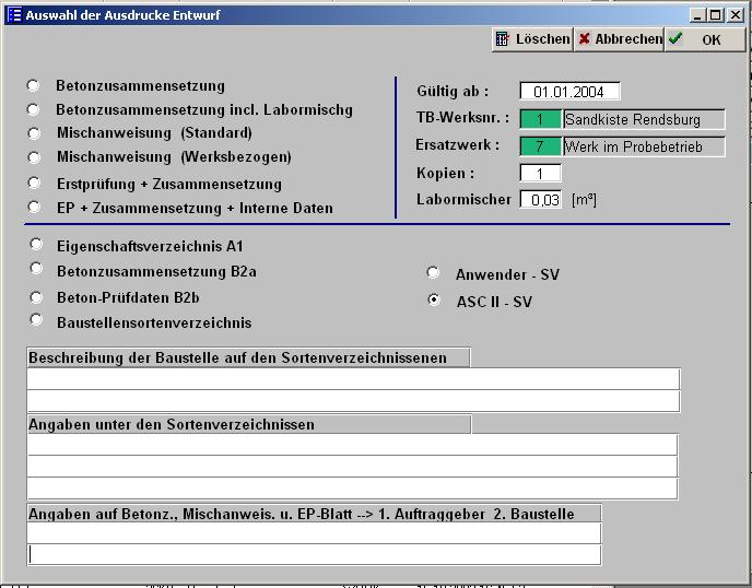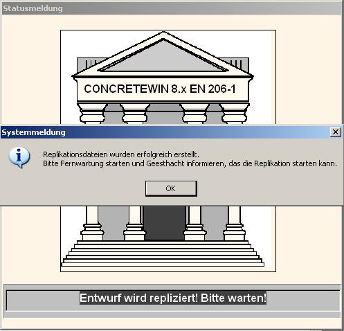 Gehen Sie auf dem Master-Rechner in CONCRETEWIN. Das Auswählen der zu replizierenden Rezepturen entspricht dem normalen Drucken im Entwurf. Aber anstatt den Report auszuwählen, den Sie ausdrucken wollen, klicken Sie nur ASC-II SV an. Wenn Sie ASC-II SV anklicken, dann wir kein Papier bedruckt, sondern die Daten in einer Datei gespeichert. Anhand dieser Datei werden dann die Daten der Ausgangstoffe, der Sieblinien und weiterer Angaben zusammengestellt und können repliziert werden. In der nächsten Maske wählen Sie wie gehabt die zu replizierenden Rezepturen aus oder geben klicken die Schalter Alle Werke und Alle Rezepturen an. Wenn Sie den OK-Schalter anklicken, werden die Daten in eine Datei zwischen geschrieben. Gehen Sie jetzt ins Menü 9 Daten Im-/Export Hier gibt es die Punkte 11 Replikation Export und 12 Replikation Import. Führen Sie den Menüpunkt 11 aus. Ihre Daten werden zusammengestellt. Es erscheint die Meldung über den erfolgreichen Export und das nun die Daten von dem Slave (im Beispiel in Geesthacht) abgerufen werden können. Als folgendes muss die Arbeit auf dem Master-Rechner in CONCRETEWIN eingestellt werden. Anschließend wird von dem Slave-Rechner aus die Software pcAnywhere gestartet. Meistens haben wir ein entsprechendes Symbol auf den Desktop hinterlegt. Die Replikation der Daten zum Slave geschieht automatisch und dauert einige Minuten. Nachdem die Übertragung beendet ist, starten Sie auf dem Slave-Rechner CONCRETEWIN. Gehen Sie in 9 Daten Im-/Export und dort auf den Menüpunkt 12 Replikation Import. Die Daten werden importiert und stehen im Entwurf zur Verfügung. |