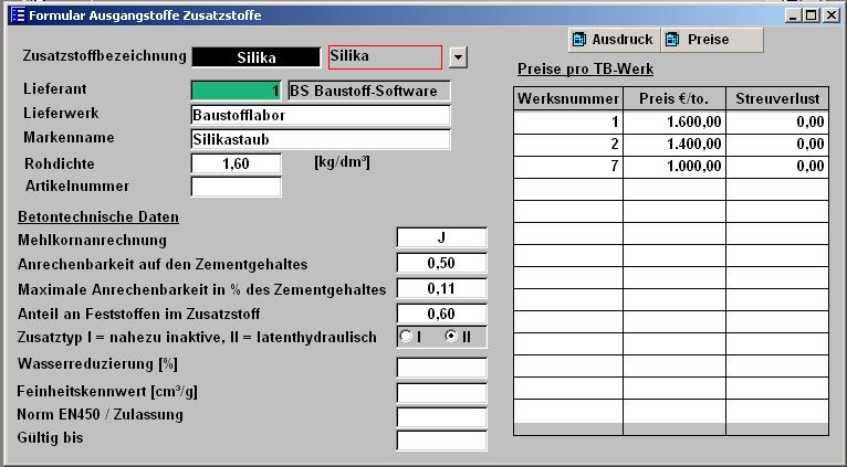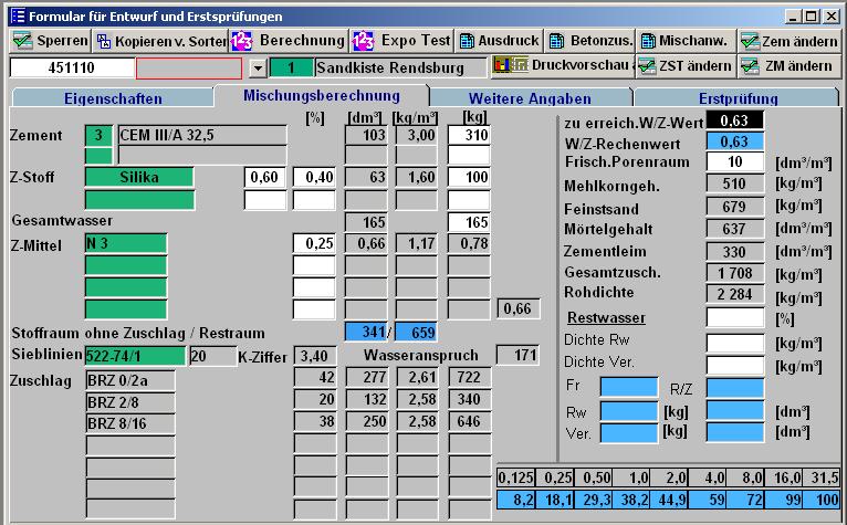 Der Einsatz von Silikaten und anderen Zusatzstoffen auf flüssiger Basis im Beton nimmt immer mehr zu. Um die korrekte Berechnung in CONCRETEWIN zu gewährleisten, müssen bestimmte Kennwerte beim Zusatzstoff eingegeben werden. Im Feld Anteil an Feststoffen im Zusatzstoff muss angegeben werden, wie viel Prozent Feststoffe sind. Ein normaler Füller hat 100% = 1,00. Das obige Beispiel hat 60 % Feststoffe. Die anderen 40 % sind Wasser und müssen deshalb beim W/Z-Wert mit berücksichtigt werden. Der W/Z-Wert errechnet sich wie folgt: 100 kg ZSt * 0,60 = 60 kg (Fester) Zusatzstoff; In den Ausgangstoffen ist hinterlegt, das die maximale Anrechenbarkeit in % des Zementgehaltes 0,11% betragen darf. 310 kg Zement * 0,11 = 34,1 kg (Fester) Zusatzstoff dürfen angerechnet werden. Damit dürfen von den 60 kg nur 34,1 kg angerechnet werden. Diese werden mit 0,40 angerechnet. 0,40 * 34,1 = 13,64 kg. 100 kg - 60 Kg = 40 kg (Flüssiger) Zusatzstoff = 40 kg Wasser. Dieser muss auf das Wasser angerechnet werden. Wasser + Flüssiger ZSt / Zement + Fester ZSt = 165 + 40 / (310 + 13,64) = 0,63 |