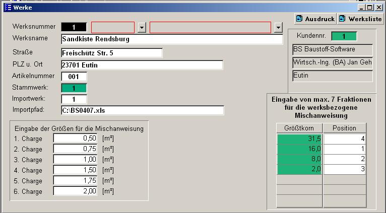 Werke können sowohl bei den Rezepturen wie auch bei den Beton- und Gesteinskörnungsprüfungen verwendet werden. Der eindeutige Schlüssel ist die Werksnummer. Im Entwurf besteht der eindeutige Schlüssel aus Sortennummer und Werksnummer. Man kann ein Werk auch einer Kundennr. zuordnen. Dieses ist jedoch nur rein informativ. Das Feld Artikelnummernkreis ist für den Datenexport wichtig. Hier können Sie die Nummer des Werkes im externen Programm angeben. Das Importwerk (-nummer) ist die Nummer, die die Mischanlagensteuerung beim Ausdruck der Produktionsstatistik verwendet. Sie kann abweichen von der Werksnummer in CONCRETEWIN, muss aber nicht. Dieses Feld wird beim Import der Produktionsdaten benötigt. Im Feld Importpfad wird der Pfad- und Dateiname der Produktionsstatistik erfasst. Dieses Feld wird beim Import der Produktionsdaten benötigt. --> Produktionsdaten Die Chargen werden für den Ausdruck der Mischanweisung benötigt. Für Handverwiegung werden für die einzelnen Chargen dann die Mengen bestimmt. Das Größtkorn und die Position ist wichtig für die Werksbezogene Mischanweisung. Bis zu sieben Fraktionen können angeben werden. Die Positionen dürfen keine doppelten Nummern enthalten! |